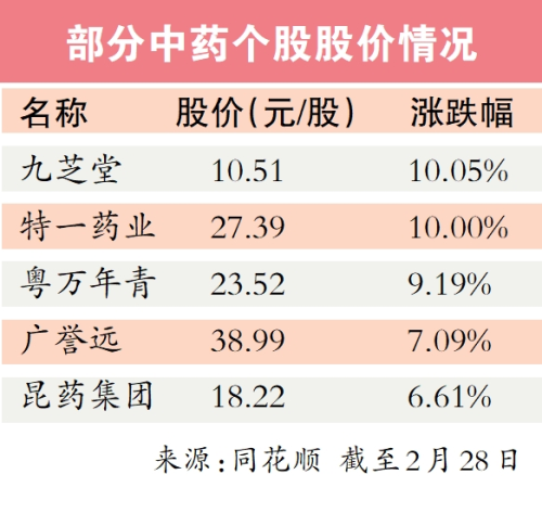 2月28日,国务院办公厅印发《中医药振兴发展重大工程实施方案的通知》,目标是到2025年,优质高效中医药服务体系加快建设,中医药防病治病水平明显提升,中西医结合服务能力显著增强,中医药成为全面推进健康中国建设的重要支撑。记者留意到,此次方案还提出要促进中药材种业发展,推进中药材规范种植。实际上,包括白云山、紫鑫药业、达仁堂、信邦制药、贵州百灵、振东制药等药企在内,都属于中药种植概念股。
