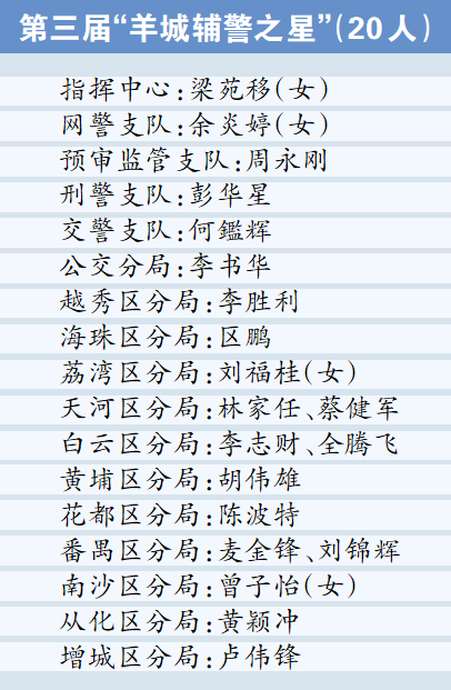 有人用脚步编织出一张无形的地铁“安全网”;有人勇闯火海救出被困母子;有人一路“狂飙”力擒逃犯;有人是反诈能手,协助民警为群众挽损1300多万元……他们是广州辅警的优秀代表。昨晚,第三届“羊城辅警之星”暨“百佳百优辅警”发布活动在广州市公安局举行。该活动遴选出200名“百佳百优辅警”,其中“羊城辅警之星”20名。