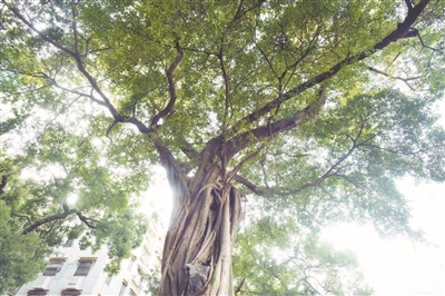 该古树植于沙基涌边,古树下方岸边的百年埗 头至今保存完好,曾用于小船停靠和装卸货物。而古树的对面是1840年开始运营的礼和洋行货仓,1949年后曾做南方日报宿舍、珠江工具厂、住宅等。古树与其相伴比肩百年风雨,未曾退却,葱葱绿绿,高大挺拔。