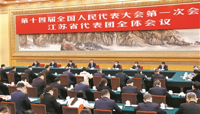 习近平来到江苏代表团,现场响起热烈掌声。