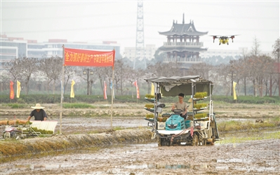 广州日报讯 (全媒体记者陈明、石忠情 通讯员莞农宣摄影报道)无人机喷药、 旋耕机翻地、机器插秧……昨日,在麻涌镇华阳湖美丽田园内,2023年东莞市春耕生产暨农业科技和保险支农服务下乡现场会召开。会议通过“现场观摩+技术讲解”等方式,对全市春季农业生产工作进行动员部署,为乡村振兴按下“加速键”。
