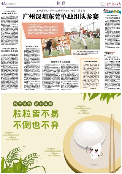 日前,国家体育总局青少年体育司宣布,中华人民共和国第一届学生(青年)运动会将于今年11月在广西举行,不同于以往的全国青运会和中(大)学生运动会,该项新创体育盛会将由各地市和直辖市下辖区组队参赛,组队形式类似于早年间举行的全国城市运动会,广东省将派出广州、深圳和东莞三支队伍参加争夺,力争赛出风格、创造佳绩。