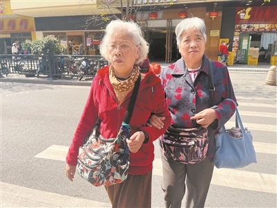 谭卫英(左)与梅素娉结伴外出时总是互相搀扶。