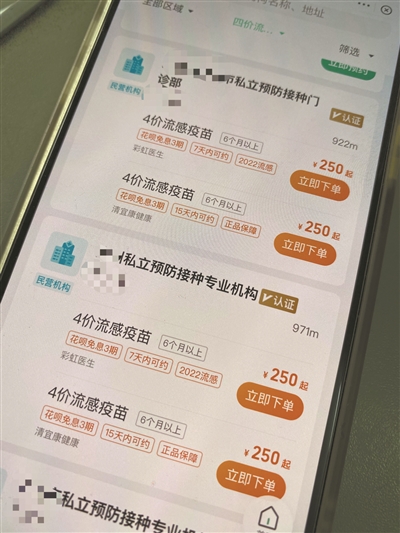 从平台可预约的情况来看,至截稿时,广州市场三价流感疫苗(3岁以下)、四价流感疫苗(3岁以下)有不同区的社区卫生服务中心的号源可选择,不过部分显示号源紧张;四价流感疫苗(3岁及以上)则供货紧张,主要是私立预防接种机构提供代预约服务。平台一预约服务商家显示,广州成人四价流感疫苗套餐销售为250元,显示“现货7天开针”。该商家客服人员表示,为了让客户尽快能接种疫苗,下单后并不能指定医院,“将会为您优先安排疫苗充足且适配订单的正规(私立)接种门诊接种疫苗。”另外,客服表示也不能指定品牌,因为不能承诺一定能约到用户指定的疫苗品牌。