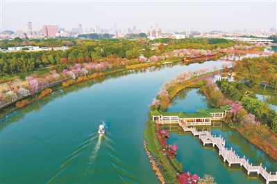 羊城三月,繁花似锦。海珠湿地、花都湖的宫粉紫荆,中山纪念堂的木棉花,华南植物园里的禾雀花……一簇簇、一丛丛,开得绚烂、开得梦幻。与遍布全城的花海相得益彰的是头顶的蓝天、门前的绿水、林间的鸟鸣,近年来,广州深入践行习近平生态文明思想,坚持生态优先、绿色发展,努力构建绿美广州生态新格局,绘就人与自然和谐共生的壮美画卷。