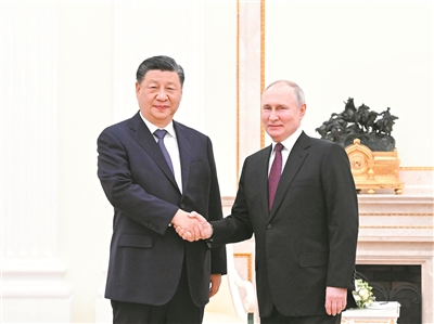 普京热烈欢迎习近平对俄罗斯进行国事访问,对习近平连任中国国家主席再次表示热烈祝贺。普京表示,过去十年来,中国各方面发展都取得令世人瞩目的伟大成就,这归功于习近平主席的卓越领导,也证明了中国国家制度和治理体系的优越。我坚信,在习近平主席坚强领导下,中国必将继续发展繁荣,顺利实现各项既定宏伟目标。在双方共同努力下,近年来俄中关系在各领域都取得了丰硕成果。俄方愿同中方继续深化双边务实合作,加强在国际事务中的沟通协作,推动世界多极化和国际关系民主化进程。