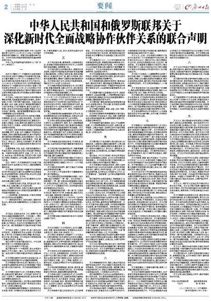 双方强调,巩固和深化中俄新时代全面战略协作伙伴关系是双方基于各自国情作出的战略选择,符合两国和两国人民根本利益,符合时代发展潮流,不受外部影响。双方将: