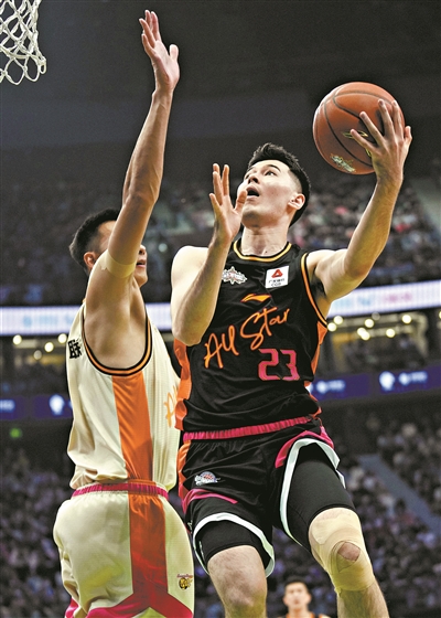 获得全明星正赛MVP的北区明星队球员阿不都沙拉木(右)在比赛中上篮。@新华社