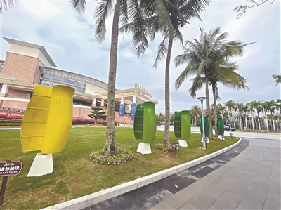树木掩映之下,论坛主会场和新闻中心等建筑的屋顶铺满了光伏面板,仿佛是戴上了一顶遮阳帽,为的就是节约哪怕一度电。建筑两侧,花朵风机随风转动,它可以在微风状态下收集风能实现发电。
