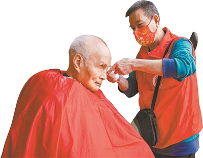 志愿者在为刘树光老人理发。