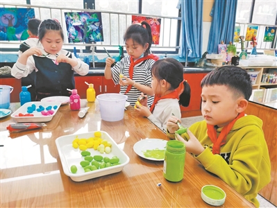 该校语文老师马春华介绍,本学期三年级的跨学科主题为“蚕之蜕变——制作蚕丝文创用品”,以“如何制作蚕丝文创用品”为驱动性问题,整合语文、数学、英语、音乐、美术、科学等科目进行教学。“整合并非简单地拼盘。”马春华介绍,如“蚕之蜕变”跨学科主题涉及多个学科,整合前需要15个课时,而整合后共计13课时,分成“蚕之蜕变”“制丝之路”“制作装扮”三大任务,每个任务下又有任务线索为引子的学科内容。在一个跨学科主题下,既有相互独立的学科,又有相互融合的学科。如用英语介绍蚕丝制作过程就放在英语课上,而设计蚕丝文化扇面则是语文+美术的跨学科合作,学生收集蚕文化的诗文作品,根据色彩搭配,在扇面上设计适当的绘画。马春华表示,小学课文很多知识都能用作跨学科教学。“如以桥为主题,课文有《赵州桥》《卢沟桥》等,数学老师可以讲解桥梁数据、桥梁的建模、计算工程造价,科学老师可以讲解桥梁结构、如何稳固桥梁,而美术老师可以从桥的美化方面给学生以启迪。”