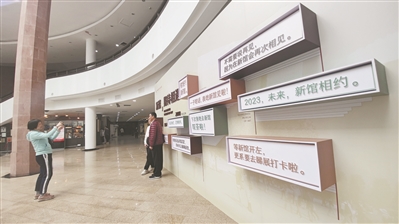 搬家,是新生活的开始,也总伴随着不舍。在这“麓湖时光”的最后几个小时里,许多人赶来,在百花庭院的广场上看鸽子,在序厅里“新馆,期待相遇”的背景墙前留影,在过厅里的红色邮筒前盖下印戳。