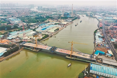 昨日,中铁四局承建的东莞槎马特大桥主跨顺利合龙,该桥是东莞中(堂)洪(梅)路工程控制性节点,大桥全长686.5米,横跨中堂镇倒运海水道。图为东莞槎马特大桥主跨合龙段施工现场(无人机照片)。新华社发