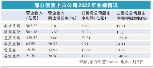 医美上市公司迎来年报密集披露期,记者从东方财富choice获悉,截至4月3日,在21家已披露2022年年报的医疗美容概念上市公司中,12家实现归母净利润的同比正增长,占比约六成。