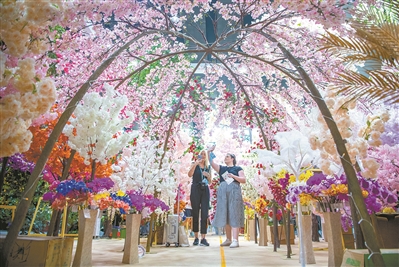 A区的一个展位上布满了仿真花卉,成为热门拍照打卡地。
