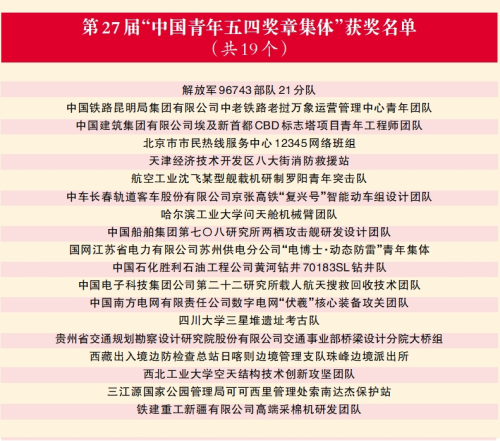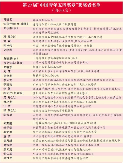 为充分发挥青年典型模范带头作用,激励广大青少年踔厉奋发、挺膺担当,以朝气蓬勃、锐意进取的精神状态积极投身全面建设社会主义现代化国家的火热实践,共青团中央、全国青联日前决定,授予马晓云等30名同志第27届“中国青年五四奖章”,授予航空工业沈飞某型舰载机研制罗阳青年突击队等19个青年集体第27届“中国青年五四奖章集体”。
