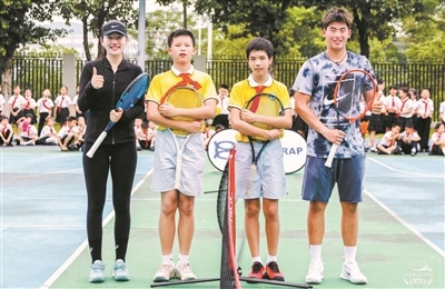 陈佳慧和李文夫先在体育馆与孩子们进行了交流互动,随后,和网球小将一起移步到室外操场展开一场激烈的友谊赛,两人和孩子们打出的多拍回合球,引来现场阵阵惊叹。在分享问答环节,李文夫说,成为一名职业球员,要经历多年的艰苦训练,磨炼坚强的意志品质,还要有对网球运动的热爱。陈佳慧表示,这是她第一次走进校园和孩子们互动,感受到了大家的热情,“有几个小朋友打得很好,假以时日他们也会成长为不错的网球运动员。”