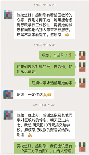 区敏玲的先生吴老师和红旗中学校长陈亚玲的微信对话。区敏玲“头七”后,她的先生把10万元善款捐给红旗中学。