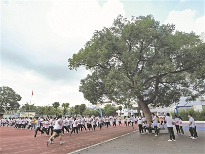 香樟树下,学生们在锻炼身体。广州日报全媒体记者王名润摄
