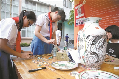 参加广彩工作坊的学生在现场展示制作过程。广州日报全媒体记者骆昌威摄