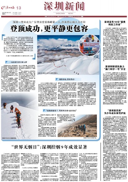 47岁的陈国庆是一名律师,曾获得中国法学会2017年度刑事辩护杰出成就奖。经过多年准备,今年5月,他成功登顶众多攀登爱好者心目中的圣山——海拔8848.86米的珠穆朗玛峰,成为了广东省第一个登上珠峰的律师。