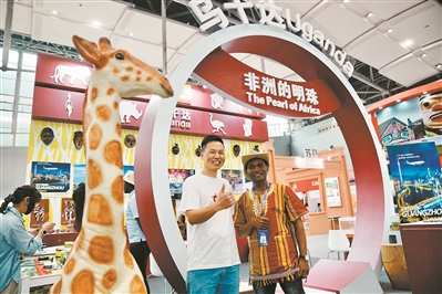 乌干达亮眼的展台吸引参观者合影留念。