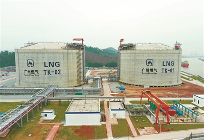 南海之滨,两座巨型储罐矗立在小虎岛上。这就是广州LNG(液化天然气)应急调峰气源项目一期的两个储罐,储罐高约50米、直径超80米,单个罐容可达16万立方米。