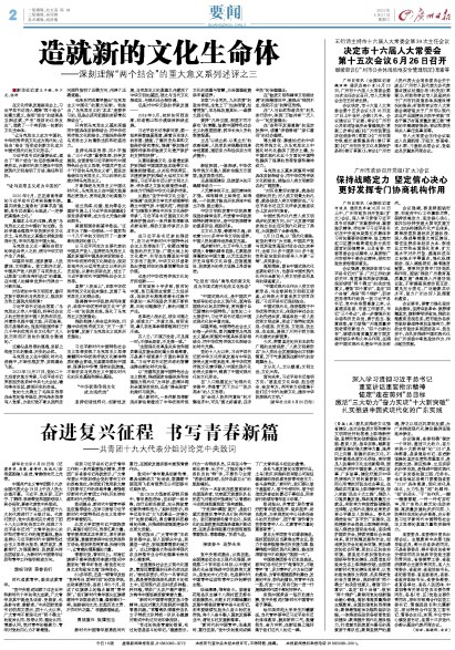 (紧接1版)要扎实推进文化强省建设,在交出物质文明和精神文明两份好的答卷上取得新突破,坚持用党的创新理论武装头脑、教育人民、指导实践,凝聚奋进新征程的强大精神力量,涵养向上向善、刚健朴实的文化,不断丰富高品质文化供给,更好满足人民精神文化生活新期待,面向世界讲好中国故事、大湾区故事、广东故事,建设好展示中华民族现代文明的重要窗口。要用心用情抓好民生社会事业,在推动共同富裕上取得新突破,深入实施“民生十大工程”,推动人口高质量发展,推动高质量充分就业,采取有力有效措施破解民生难题,让现代化建设成果更多更公平惠及人民群众。要扎实推进法治广东平安广东建设,在构建新安全格局上取得新突破,深入推进全面依法治省,坚决维护国家安全,持续完善社会治理体系,更好统筹发展和安全,创造更加安全的政治环境、更加稳定的社会环境、更加公正的法治环境。要坚定不移加强党的全面领导和党的建设,在营造良好政治生态上取得新突破,全面落实新时代党的建设总要求,以党的政治建设为统领,扎实推进党的各方面建设,深刻领悟“两个确立”的决定性意义,增强“四个意识”、坚定“四个自信”、做到“两个维护”;聚焦用党的创新理论凝心铸魂,高标准高质量推进主题教育,全面加强党的思想建设;聚焦增强政治功能和组织功能,一体推进各层级各领域党组织建设;聚焦提升现代化建设能力,打造堪当民族复兴重任的高素质干部队伍;聚焦坚持严的基调,持之以恒正风肃纪反腐,为广东推进现代化建设提供坚强政治保证。