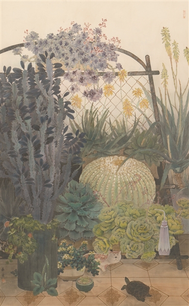 “生活是艺术创作的源泉”这句话,形容广美中国画学院的毕业生刘嘉意的作品很是贴切。这幅高1.8米的大画《绿意空融》呈现的是绿意盎然的阳台一角,这里生长着各式多肉植物,它们的原型是陪伴了作者大学四年生活的阳台“多肉们”。为了丰富创作,刘嘉意去到了广州芳村的花卉市场,还去到了学校附近的居民小巷,收集老广们中意的多肉植物,比如作品中的龙骨,就是岭南院落中常见的多肉植物品种。“多肉植物的生长往往象征着生命,无论在什么地方,它们以块根及叶片中的蛋白质和水分得以生存。棱角和棘刺象征着它们的顽强,对于我来说,是我大学生活中偶尔失落、疲惫的抚慰,也是坚定的陪伴。我想,这就是植物之于普通人的意义。” 刘嘉意说道。