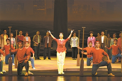 剧中的沙岛村民尽管早已结束水上生活,但在生活方面依旧留有疍家人水上生活的痕迹。因此,该剧舞美布景在展现生活场景方面融入了水上人家的元素。该剧借助了大型机械舞台和现代时尚的多媒体技术,舞台在广州现代都市朦胧的远景衬托下,营造出屋舍俨然、良田美池、鹭鸟江天的“都市桃源”诗意场景。