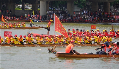 作为今年中堂镇龙舟文化节的“重头戏”——龙舟巡游趁景活动,有来自19个村(社区)的龙舟队和一支网格+消防联队参加。传统犒船仪式之后,各支龙舟队在江面自由“趁景”。接着各支龙舟队纷纷划入东江河道,按照组别进行约1300米的竞渡表演,只见江面龙舟争渡,浪花激扬,划手们踩着鼓点,精神抖擞,击水奋楫,吆喝声铿锵有力,动作整齐划一,展示出团结拼搏、激流勇进的精气神。龙舟健儿的精彩表演和运动风采引得岸边市民喝彩、欢呼声不断,为他们加油鼓劲,现场热闹非凡,充满了浓浓的节日氛围。