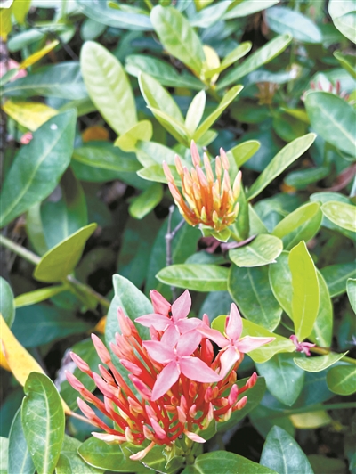 夏天之所以好养活,因为它不怕热,适合高温及日照充足的环境。据了解,龙船花原本生长在东南亚地区和我国南部,在我国海南、两广等地,一年四季基本都有花可赏,其他地区则以夏秋时节花开最为旺盛。不但花蜜是蜜蜂和蝴蝶喜爱的食物,近乎球形的浆果也是小鸟的主要食物来源之一。果实成熟后颜色由鲜红变为墨绿,龙船花之所以又被美誉为“山丹花”“仙丹花”,正是因为其孕育出来的小浆果色泽太过诱人。