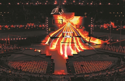在人们的深情注目下,火焰缓缓熄灭,幻化成一颗闪亮的火种。腾空飞起的“太阳神鸟”衔起火种,传递到一名青年手中,然后盘旋上升飞向远方。
