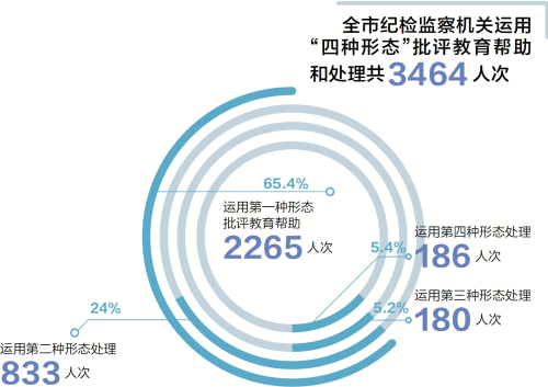精准运用政策策略,综合运用“四种形态”批评教育帮助和处理3464人次,其中,运用第一种形态批评教育帮助2265人次,占65.4%;运用第二种形态处理833人次,占24%;运用第三种形态处理180人次,占5.2%;运用第四种形态处理186人次,占5.4%。