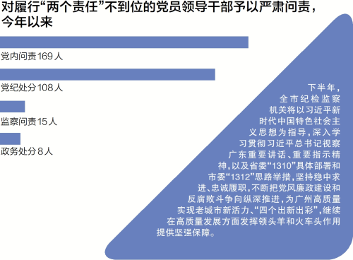 全市纪检监察机关严肃问责履行“两个责任”不到位的党员领导干部,今年以来党内问责169人,党纪处分108人,监察问责15人,政务处分8人,以精准问责促履职尽责。