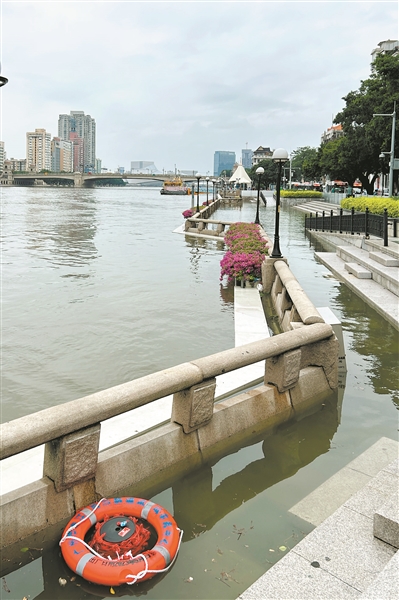 昨日下午,受台风外围扰动及天文大潮影响,广州南方大厦附近珠江河段潮水漫上了亲水平台。广州日报全媒体记者廖雪明 摄