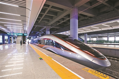广汕高铁最大的车站新塘站昨日正式投入运营,图为复兴号智能车组驶进新塘站。