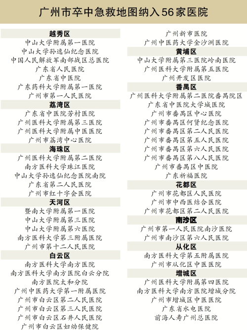 9月26日,广州市卒中急救地图正式发布,11区共56家具有卒中急救能力的医院纳入其中,形成覆盖全市的脑血管病快速救治网络,将患者、120急救系统和卒中中心医院三方紧密有效衔接,可为脑卒中患者在急救时间窗内就近选择医院提供精准导航,更大限度地为患者赢得黄金抢救时间。