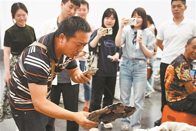 药材商现场切制中药材,且颇有自信地展示自家品相优质的药材。