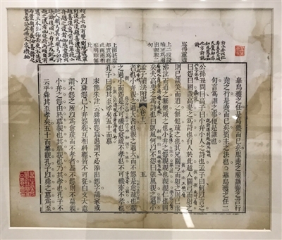 展览策展人、中山大学哲学系教授周春健介绍,此次展览共展出明清至民国木刻雕板及活字字模四十余种,雕版内容遍涉经史子集四部,更有清代康雍时期《钦定诗经传说汇纂》《钦定书经传说汇纂》等官刻精品,又有日本、韩国罕见雕板实物;另有大中小号活字字模三箱,以及江西吉安家谱活字印刷模具,品类完备。展厅墙上,则饰以木刻雕版及活字印刷古籍散页若干,雕板实物与古籍印品交相辉映,相得益彰。
