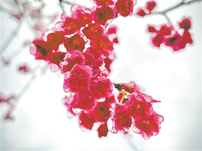 广州石门国家森林公园的樱花挂上了冰。图/广州日报全媒体记者苏俊杰、杨耀烨 通讯员罗丽芬