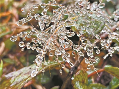 是什么让广州冷得挂冰?据气象部门介绍,帽峰山单刀松顶的自动站数据(海拔为534米)显示,前天21时开始下小雨,昨天0时开始气温便跌破冰点,3时以后一直保持在零下1℃左右,因此就形成了挂冰。