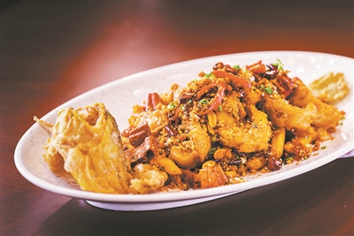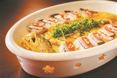 陈年花雕酒糟蒸大黄鱼,使用陈年花雕酒糟、金华火腿和笋片蒸煮大黄鱼,酒香和咸爽叠加,各种惹味在心头,鱼肉鲜美幼嫩,绝美的味觉享受。飞鸿脆椒大黄鱼,造型活泼,大有黄飞鸿打功夫的态势。口感香脆诱人,是带点辣度的大黄鱼创新做法。越吃越有滋味,有点避风塘的风格,鱼皮微焦且酥脆,鱼肉嫩滑,完全配得上“配酒恩物”称号。砂锅姜油焗大黄鱼,将广东本地老姜切条,加入鸡汤、土榨花生油,姜的辛辣味辟腥、提鲜,这锅大黄鱼相当入味。