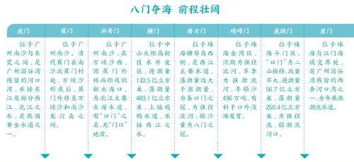 至此,珠江“三江入粤、八门出海”的格局正式形成。八门分布在珠江三角洲自东至西长达450公里的海岸线上,最东是虎门,最西为崖门。东四门主要承接东江、北江和部分西江水,由伶仃洋汇入南海。西四门承接西江和北江之水,主要在黄茅海等处注入南海。