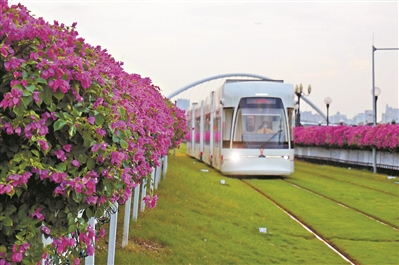 有轨电车两侧开满了簕杜鹃。(资料图片)广州日报全媒体记者骆昌威 摄