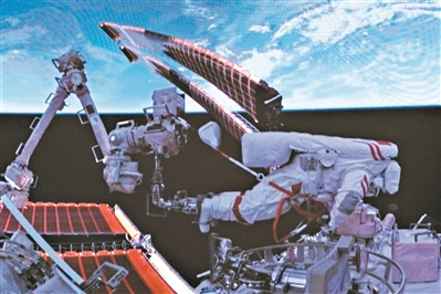 昨日,神舟十八号乘组航天员叶光富、李聪、李广苏密切协同,在空间站机械臂和地面科研人员的配合支持下,完成了空间站空间碎片防护装置安装、舱外设备设施巡检等任务。叶光富、李广苏已安全返回问天实验舱,神舟十八号乘组首次出舱活动取得圆满成功。图为叶光富在空间站组合体舱外作业的画面。新华社发