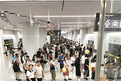 番禺站站台客流如织。广州日报全媒体记者骆昌威 通讯员李雯敏、张慧雅 摄