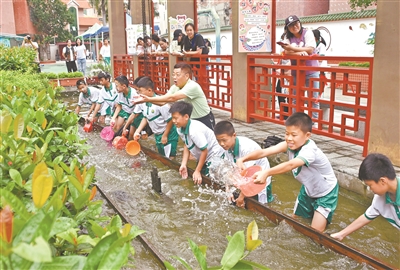 洗龙船,绘画卷,在湿地公园感受绿美荔湾。6月7日,“绿美广东 老少同行”粤港澳青少年生态文明实践活动荔湾站暨龙舟文化艺术节在广州市荔湾区西关实验小学龙溪学校拉开序幕。