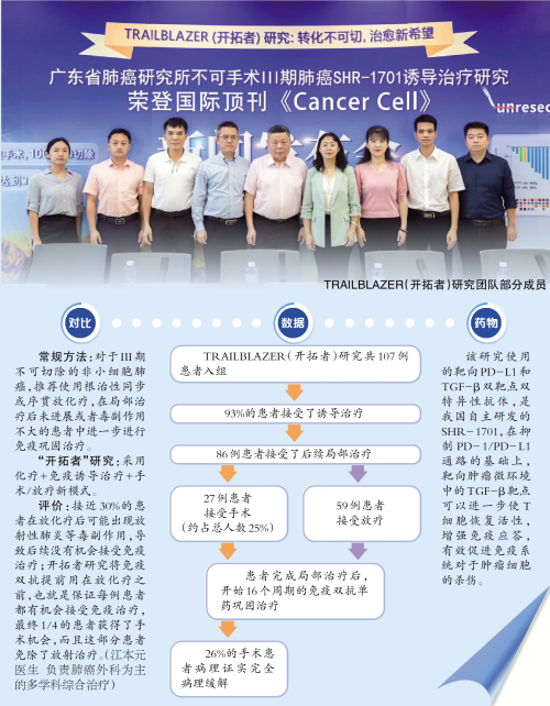 这位老人参加的是肺研所不可手术III期NSCLC SHR-1701诱导治疗研究,即TRAILBLAZER(开拓者)研究。研究首次提出诱导治疗机制,将III期“不可切”转化为“可切”,成果已在北京时间6月20日在国际顶级医学期刊《Cancer Cell》上发表。