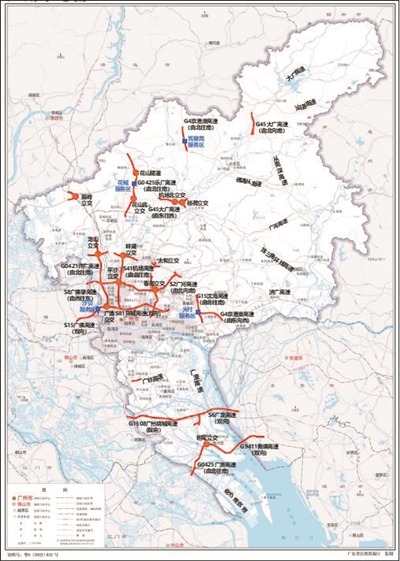 预计拥堵路段主要分布在机场高速、华南快速、许广高速、京港澳高速、广佛高速、北环高速、广澳高速、莞佛高速等重要的市域对外联系通道上,主要出现在立交、出入口、隧道等局部路段。路段方面,机场高速(三元里—蚌湖立交段)、乐广高速(花山互通立交—花山隧道段)、华快三期(平沙立交—朝阳立交段)、华南快速路(岑村立交—春岗立交段)、沈海高速(北二环,蚌湖立交—龙山立交段、火村立交—萝岗立交段)、广州绕城高速(南二环,东涌立交—张松立交段)、莞佛高速(坦尾立交—虎门大桥段)、北三环(机场北立交—杨荷立交)等瓶颈路段容易出现拥堵。同时,京港澳高速瓦窑岗服务区、乐广高速花城服务区、沈海高速(北二环)火村服务区等高速服务区预计将会出现车流量密集,容易引起车辆排队进入服务区情况,可能出现车流倒灌影响主线通行。